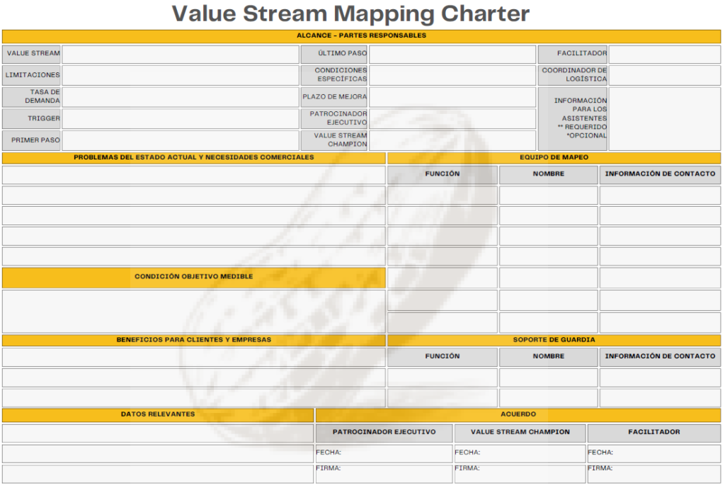 El VSM Charter permite identificar de antemano los recursos necesarios y las responsabilidades de cada miembro del equipo. Esto incluye la designación de roles clave como el patrocinador ejecutivo, el facilitador y los miembros del equipo de mapeo.
